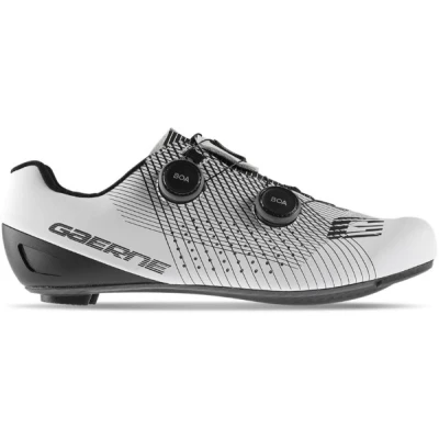 Meticulously crafted for an elevated riding experience with refined materials and cutting-edge technology.The microfiber material is strategically perforated to prioritize breathability and enhance air ventilation, keeping your feet cool and dry throughout your ride. Internally, the shoe is combined with mesh to provide long-lasting foot support and enhancing the stability.The DUAL FITTING CLOSURE SYSTEM, featuring two independent BOA Dial Z dials, offers tailored fit adjustments for both the instep and forefoot areas, ensuring precise, quick, and personalized closure without any pressure points. The L6 DIAL Z, renowned for its premium aerodynamic design, features an optimized rubberized finish to provide an effective and secure grip.The COMFORT FIT TONGUE incorporates a high-tech cushion layer for enhanced comfort and breathability.The integrated anti-slip heel cup enhances foot stability and control for an improved riding experience.EPS TRANSPIRANT INSOLE, featuring anatomical support for comfort and pedaling efficiency.The GAERNE EPS LIGHT WEIGHT FULL CARBON SOLE 10.0 ensures both lightness and rigidity, maximizing power transmission with its ultra-thin carbon construction. Two channels on the sole optimize foot ventilation during use. Frontal non-slip inserts and rear replaceable PU inserts provide secure walking. The sole is compatible with all clipless pedals, boasting an index of rigidity 10.UPPER MATERIAL: perforated microfiber for enhanced breathabilityCLOSURE SYSTEM: Dual Fitting Closure System for precise and personalized fitBOA: L6 Dial Z for quick adjustmentsTONGUE: Comfort Fit Tongue for enhanced comfortHEEL CUP: Integrated anti-slip heel cup for stabilityINSOLE: EPS Transpirant InsoleSOLE: Gaerne EPS light weight full carbon sole 10.0 for stiffnessINDEX OF RIGIDITY: 10WEIGHT: 273 g (size 43)MADE IN ITALY