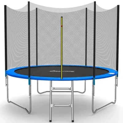 ManoManoGeneral description The GALACTICA Trampoline Set is an 8FT round outdoor trampoline designed for safety and durability. It features a safety net enclosure that provides 360-degree protection for children, making it a perfect play area for families and outdoor gardens. Technical specifications Model No.: GT-TS-01 Colour: Blue Frame Diameter: 8 feet (2.44m) Frame Height: 500mm Jumping Mat: UV resistant black PP material Spring Cover: 150g/m2 PE + 110g/m2 PE Frame Tube: Galvanized 38mm (Dia) × 1.1mm Springs: 42 pcs, 3.0mm (Dia) × 25N × L130mm Legs: 3 pcs, galvanized 35mm (Dia) × 1.1mm Safety Net: PE mesh 95g/m2 Pole: 25 (Dia) × 1.1mm, 6 pcs Ladder size: 55 × 31 cm with 2 steps Enclosure height: 150 cm Max Load: 50 kg Carton 1 Size: 132 × 44 × 16 cm N.W.: 22 KGS G.W.: 24 KGS Carton 2 Size: 96 × 31 × 16 cm N.W.: 8 KGS G.W.: 9.7 KGS Other information Ultra-thick steel pipe for enhanced safety and durability Entrance zipper design for easy access and secure locking 100% UV resistant and