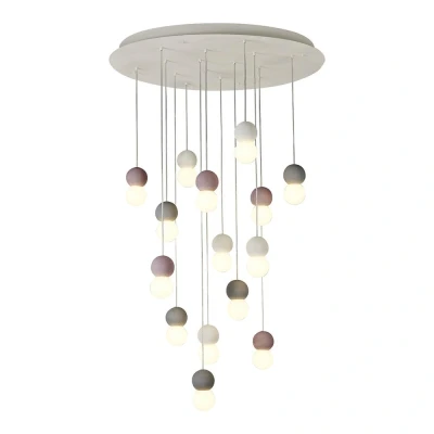 The Galaxia Pendant Round features an eye-catching design with 15 lights. Crafted in a striking white, grey, and red cement finish, this fixture is dimmable, allowing for personalized lighting options.