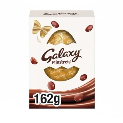 A sophisticated Easter egg made from smooth Galaxy milk chocolate and including two packs of Galaxy Minstrels This chocolate easter egg is a divine piece of indulgence, even more decadent when shared It also adds some luxury to an Easter hamper or chocolate bouquet set to please any chocolate lover This Easter egg carton is fully recyclable A hollow milk chocolate Easter egg with two 42g packs of Galaxy Minstrels Hollow egg is Galaxy smooth milk chocolate Contains crunchy caramel pieces, dusted with a gold coloured coating Ideal gift for Easter or for Easter egg hunts Suitable for vegetarians