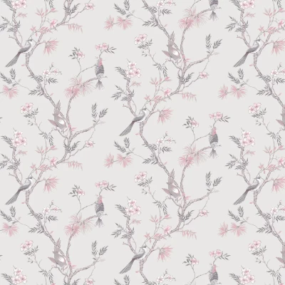 Create a soft ambience in your home with this trailing design, featuring intricately illustrated birds and a delicate display of flowers and leaves. Shown here in the pink colourway, and set against a taupe ground.