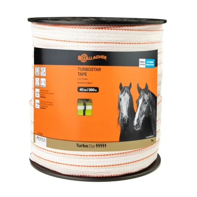 Electricfence-online.co.ukGallagher TurboStar tape 40 mm/350 m (white). Our premium wide tape for medium to long fence installations. An extremely tear-resistant, highly conductive Gallagher TurboStar pasture fence tape (wide tape) for long, permanent horse fences. It offers excellent visibility and is particularly stable due to the reinforced edge. Guaranteed power supply along the entire length of the fence thanks to excellent conductivity. The unique composition ensures 40x better power conduction than standard pasture fence tape. The wide strip is equipped with 10 x 0.2 stainless steel conductors as well as 4 x 0.3 copper conductors (tinned). The UV-resistant plastic made of PE monofilaments and the high-quality workmanship guarantee a long-lasting and robust fence. * Ideal for long, permanent fences for horses and ponies * Good visibility due to orange colour stripes * 10 stainless steel conductors and 4 copper conductors for reliable current flow * 40x better conductivity than the standard 40 mm wide strip * Resistance: 0.04 Ohm/m * Tear strength: 520 kg * UV-resistant for long durability * Robust and durable * Easy and quick to install * 7-year UV guarantee