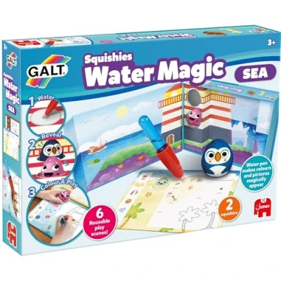 MAGICAL REUSABLE COLOURING FUN: Bring scenes to life with just water; Watch as vibrant colours and adorable sea animals magically appear using the special water pen: no mess, no stress, optimal for kids aged 3 plus SURPRISE SQUISHIES INSIDE: Discover 2 hidden squishy characters that add extra excitement and tactile play to every colouring adventure; a delightful bonus for curious little hands COMPLETE TRAVEL-FRIENDLY SET: Includes 2 squishy characters, 3 reusable drawing boards, 1 easy-to-fill water pen, and a magnetic storage box: optimal for mess-free entertainment at home, in the car, or on a plane ENCOURAGES CREATIVITY AND IMAGINATION: Kids can invent their own ocean stories while developing fine motor skills, colour recognition, and creativity with every magical reveal MESS FREE AND REUSABLE: Designed for ages 3 years and up, this planet friendly activity set offers hours of repeatable fun without the need for paints or crayons: just refill the water pen and colour again, Manufacturer: James Galt & Co Ltd
