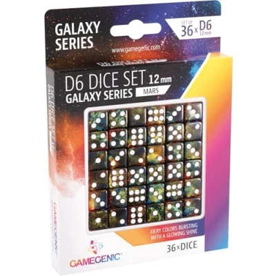 Set of 36 premium D6 acrylic dice Galaxy Series: Attractive colors and sparkling effects thanks to its glitter particles. All dice have rounded edges. The dots are an ideal size and look perfectly. Dice Size: 12mm, Manufacturer: Gamegenic