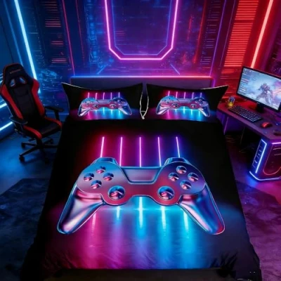 Gaming Bedding Set for Boys Youth Teens Super King Size Modern Gamer Comforter Cover,Video Game Duvet Cover Kids Girls, Novelty Gradient Action Buttons Decor Printed Bedspread