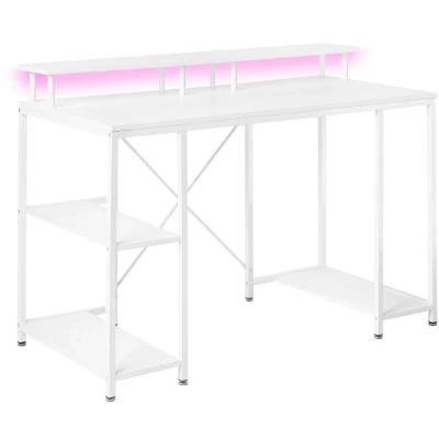 LED Gaming Desk with Space-Saving Shelves. Level up your setup with this industrial gaming desk featuring integrated LED lighting for a cyberpunk atmosphere. It offers a 3-tier side shelving unit and a raised monitor stand that maximises your work surface while keeping gear organised. The robust iron frame provides the rock-solid stability needed for intense sessions, blending metal aesthetics with modern gaming functionality. Details: Product Type: Home Office Desk General Color: White Frame Colour: White Material Type: Engineered Wood Main Material: MDF Additional Material: Iron Legs material: Metal Top Material: Engineered Wood Shape: Rectangular Drawers: No Finish: Powder Coated Dimensions: Depth: 60 cm Width: 120 cm Height: 86 cm Weight: 20 kg Weight Capacity: 60 kg Offer Includes: 1 x Desk, 2 x LED stripe (120 cm each) Key Features: Modern Design, Eye-Catching LED Light Creates Pleasant Ambience, Robust Frame, Ideal for Home and Office Workspace, Additional Storage Space, Safe