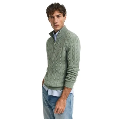GANT Men's Cotton Cable Half Zip Pullover Sweater, Khaki Green Mel, L