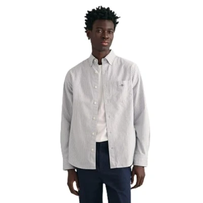 AmazonA foundation for any modern wardrobe this authentic cotton Oxford shirt is a GANT icon Yarn-dyed with a classic Banker Stripe pattern this shirt has a regular fit with a button-down collar chest pocket and curved hem It features a box pleat with the signature GANT locker loop invention at the back and an '80s archive-inspired GANT shield graphic embroidered at the chest Oxford Shirts