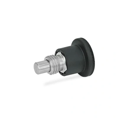 Bolt diameter d1: 10 mm; thread d2: M16; thread length l3: 11 mm Spring pressure in N: 11 (beginning) - 35 (end) Form B: without locking Guide and locking: Stainless steel stainless, 1.4305; compression spring: stainless steel stainless, 1.4310 Button: Plastic (polyamide), black matt, not demountable, Weight: 0.14770971554 pounds, Manufacturer: Ganter Normelemente