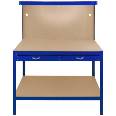General description Transform your workspace with this multipurpose 120cm workbench packed full of practical features to keep your garage organized. Whether you're in a workshop, warehouse, garage, or shed, this heavy-duty pegboard workbench is the perfect addition for maximizing storage and clearing up workspace to carry out all your DIY projects. The workbench features a bright 9W LED light fitted above the workspace to improve visibility, making it suitable for all times of the day. Technical specifications Colour: Blue Material: Powder Coated Steel & MDF Weight: 26.9kg Height: 155cm / 1.55m / 61” Width: 120cm / 1.2m / 47.2” Depth: 60cm / 0.6m / 23.6” Top Shelf Weight Capacity: 30kg Work Area Weight Capacity: 200kg Bottom Shelf Weight Capacity: 100kg Drawer Weight Capacity: 40kg Light Dimensions: 57cm L x 27mm W x 37mm D Light Power: 9W Light Voltage: 250V Power Cable Length: 2m Compatibility and accessories Includes 40 secure metal hooks for pegboard Comes with a practical rubber
