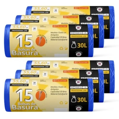 Roll Trash Bags: Measuring 55x60cm, our trash bags are tear resistant, ideal for medium 30L bins, bags made with reinforced material, perfect for all types of waste. 30L Trash Can - These trash bags are suitable for a 30L trash can. Its anti-drip system allows you to throw wet waste, preventing spills and stains. SELF-CLOSE BAGS - Our trash bags feature a simple self-closing system for easy and safe transport. Avoiding leaks and providing hygienic handling of the garbage bag. Adaptable Trash Bags: These trash bags are ideal for your kitchen, bathroom or anywhere trash can. Fits perfectly in your trash can. Wide variety of formats: at Ofituria we have a wide variety of waste bags in different sizes and ecological. Suitable for all types of waste bin.