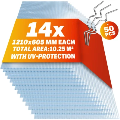 GARDEBRUK® 14x Polycarbonate Twin Wall Sheets & 50x Stainless Steel Glazing Clips 10.25 m² 4mm Double Greenhouse Roofing Clear Multi Panels Plastic Outdoor Canopy 121x60.5cm