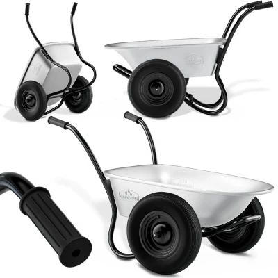 General description Your indispensable garden helper: the Gardebruk Two Wheeled Wheelbarrow is a practical wheelbarrow with a galvanised tub that offers a high capacity of 100 litres. It can be easily moved even with heavy loads, thanks to its pneumatic tyres. The two tyres ensure greater stability and easy movement, even on uneven terrain. This wheelbarrow is equipped with comfortable rubber handles and a sturdy steel frame, making it ideal for transporting leaves, wood, various building materials, tools, or garden equipment. Technical specifications Capacity: 100 litres Load capacity: up to 150 kg Dimensions: Total (LxWxH) 126x75x71 cm Tub dimensions (LxWxH) 90x63x23.5 cm Pneumatic tyres diameter: Ø 38 cm Frame material: powder-coated tubular steel Tub material: galvanised sheet steel Rim material: powder-coated steel Colour: black, silver Installation The wheelbarrow is delivered disassembled. Screws and drill holes must be adjusted during assembly by moving them slightly. Tighten