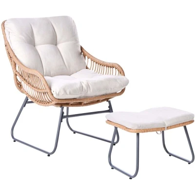 General description This stylish garden chair with a comfortable footstool is the perfect spot for relaxation. Crafted from UV-resistant high-quality PE rattan and a sturdy steel frame, it provides longevity and durability. The natural color of the chair complements many outdoor settings. Technical specifications Product Type: Armchair Style: Boho General Color: Natural, Black, Beige Shade: Light Beige Main Material: PE Rattan Additional Material: Steel Legs Material: Metal Seat Material: PE Rattan Material Composition: 100% Polyester Armrests: Yes Finish: Powder Coated Dimensions: Armrests Height: 59 cm, Depth: 81 cm, Ottoman Dimensions: 38x52x44 cm, Seat Thickness: 12 cm, Seat Height: 38 cm, Width: 69 cm, Height: 91 cm, Seating Surface: 49x60 cm Weight: 14 kg Weight Capacity: 160 kg Compatibility and accessories Offer Includes: 1 x Ottoman, 1 x Chair, 1 x Backrest Cushion, 2 x Seat Cushions Installation Full Assembly Required (20-40 min) Usage Recommended to store under cover when