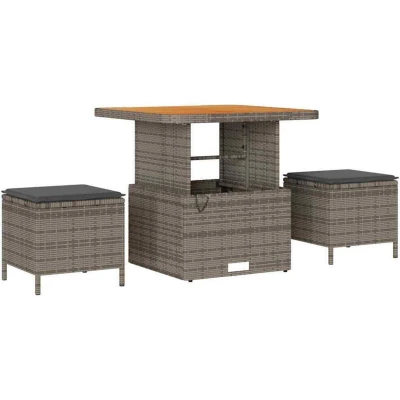 ManoManoGeneral description The Garden Dining Set combines style and practicality, making it perfect for enhancing your outdoor space. With its tidy lines and clever design, this dining set fits seamlessly into your garden, terrace, or patio, providing an excellent spot for dining and socializing outdoors. Technical specifications Colour: Grey Material: Poly rattan Assembly required: Yes Delivery contains: 1 table, 2 stools EAN: 8721158940179 SKU: 42007915 Brand: vidaXL Other information