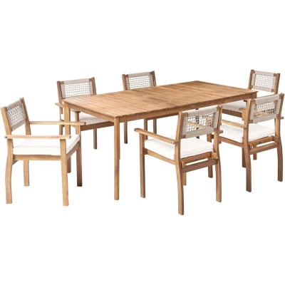 Wooden Outdoor Table with 6 Chairs. This garden dining set includes a table and six matching chairs, all crafted from acacia wood in a warm light brown shade. Naturally rich in oils, acacia wood offers excellent resistance to moisture and UV rays, making it ideal for outdoor use. The chairs feature stylish rope backrests that provide flexible support, while soft fabric seat cushions ensure enhanced comfort. The harmonious design combines durability with contemporary elegance, perfect for outdoor dining and entertaining. A sustainable and long-lasting set designed to elevate any garden or terrace. Details: Product Type: Dining Set General Color: Brown Shade: Light Brown Material Type: Wood Main Material: Acacia Wood Additional Material: Fabric Top Material: Wood Material Composition: 100% Polyester Finish: Oiled Seats Up To: 6 People Dimensions: Chair Dimensions: 55x55x85 cm Seat Height: 50 cm Table Dimensions: 180x100x75 cm Overall Dimensions: 180x100x75 Weight: 66 kg Chair Weight