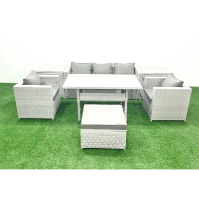 General description This 6-seater modern deluxe rattan garden furniture set is perfect for various occasions. It features a strong and durable design, complemented by a tempered glass tabletop. The included cushions are tailored to fit the sofa and chairs, ensuring comfort while enhancing the aesthetic of any garden, patio, or conservatory. Technical specifications 1 x Sofa with double armrest: 177W x 65D x 66H cm 2 x Arm chairs: 74L x 65W x 66H cm 2 x Side coffee tables: 65L x 65W x 66H cm 1 x Big footstool: 65L x 65W x 34H cm 1 x Rectangular dining table: 140L x 80W x 69H cm Material: Light grey mixed rattan with dark grey fabric Seat cushion thickness: 8 cm Tabletop: 5mm thickness transparent tempered glass Installation Items come flat packed and are easy to assemble. Sturdy galvanized steel tube metal frames with powder coating to prevent rust. Usage Low maintenance; removable cushion covers for easy cleaning. Recommended to keep cushions indoors or use a rain cover when not in