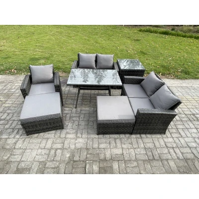 Garden Dining Set Wicker pe Rattan Outdoor Furniture Sofa with Rectangular Table Double Seat Side 2 Big Footstool Dark Grey Mixed