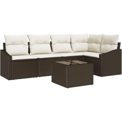 ManoManoGeneral description The Garden Dining Set with Cushion is where style meets practicality, perfect for your outdoor hangouts. With its modern look, clean lines, and flexible setup, it's just right for gatherings, making it comfy and chic. This set is all about versatility, inviting everyone to relax and enjoy while leaving a lasting impression on your guests. Technical specifications Colour: Brown and cream Material: Poly rattan and powder-coated steel Seat width: 55 cm Seat depth: 55 cm Max weight: 110 kg Assembly required: Yes Delivery contains: 1 x Corner seat 2 x Centre seat 2 x Arm sofa 1 x Table EAN: 8721288356680 SKU: 3355397 Brand: vidaXL Compatibility and accessories Modular design for flexible arrangement Hidden storage compartments in benches for cushions or magazines Installation Assembly requires a standard screwdriver and assistance from a friend Simple assembly process ensures safety and readiness for outdoor use Usage Perfect for casual lounging or hosting gatherings