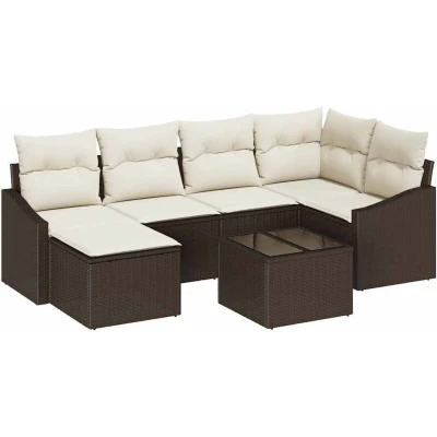 ManoManoGeneral description This trendy outdoor sofa set, perfect for six, brings a modern look to your garden or terrace. With its sleek lines and minimal fuss, it's just right for any outdoor area, blending function with style. Whether you're throwing summer parties or just chilling outside, this set is a great addition to your outdoor space. Technical specifications Colour: Brown and cream Material: Poly rattan and powder-coated steel Seat width: 55 cm Seat depth: 55 cm Max weight: 110 kg Assembly required: Yes EAN: 8721288357380 SKU: 3355467 Included Components 1 x Corner seat 2 x Centre seat 2 x Arm sofa 1 x Footstool 1 x Table Features / Function / Design Modular design allows for flexible seating arrangements Benches feature hidden storage compartments for keeping outdoor items tidy Comfy sofas with poly rattan armrests and backs for great support Foam filling for comfortable seating Tidy finishing for a neat look from all angles Care & Maintenance Cover the set when not in use or