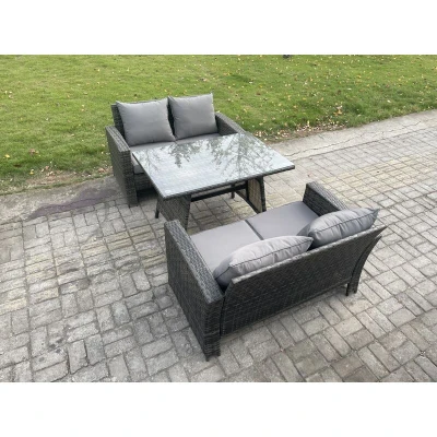 General description This 3-piece deluxe rattan sofa set is an excellent addition to your patio or garden. It features high-quality PE rattan and a durable galvanized steel construction, ensuring sturdiness and longevity. Designed for outdoor use all year round, this set combines style and comfort. Technical specifications Set Dimensions: 2 x 2 Seater sofas size: 124L x 70W x 74H cm Dining table size: 110L x 70W x 70H cm 8 cm thick seat cushion with soft pillow back cushion 5 mm thickness clear tempered glass with suckers on the surface to prevent sliding Installation Items come flat packed; self-assembly is necessary. Usage Low maintenance with removable cushion covers. Recommended to keep cushions indoors or use a rain cover when not in use. Use a rain cover for the furniture if not in use for an extended period. Other information Color may vary due to lighting or monitor settings. Important notice: Check the product carefully before signing for delivery; report any obvious damage on