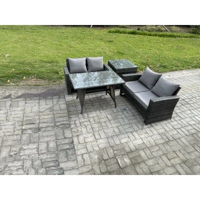 General description This 4-seater deluxe rattan sofa set is an excellent addition to your patio or garden. It is made of high-quality PE rattan and features a durable galvanized steel construction, ensuring sturdiness and longevity. This furniture set is designed for outdoor use all year round. Technical specifications Set Dimensions: 1 x Side coffee table: 65L x 65W x 66H cm 2 x 2 Seater sofas: 124L x 70W x 74H cm 1 x Dining table: 110L x 70W x 70H cm 8 cm thick seat cushion with soft pillow back cushion for added comfort 5 mm thickness clear tempered glass with suckers on the surface to prevent sliding Installation Items come flat-packed; self-assembly is necessary. Usage Low maintenance; removable cushion covers for easy cleaning. Keep cushions indoors or use a rain cover when not in use. Use a rain cover for the furniture if not in use for an extended period. Other information Color may vary due to lighting or monitor settings. Important notice: Check the product carefully before