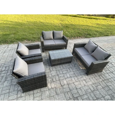 This 6 seater rattan outdoor furniture set is a great addition to patio or garden, made of high quality PE rattan and durable galvanized steel construction for sturdiness and long lasting.Durability,and this garden furniture set can be put Outdoor all year round. Set Dimensions: • 1 x Oblong Coffee table size: 85L x 50W x 37H cm • 2 x Arm chairs size: 72L x 70W x 74H CM • 2 x 2 Seater sofas size: 124L x 70W x 74H CM Dark grey mixed rattan with dark grey fabric .Color may some difference due to light or monitor .we are unable to return the item due to color problem. Items Comes Flat Packed And Easy Assemble,Sturdy Galvanized Steel Tube Metal Frames With Powder Coating To Prevent The Rust Flat PE Rattan Completely Made By Hand, 5mm Thickness transparent Tempered Glass With Sucker On Surface To Prevent Sliding Low Maintenance ,Removable Cushion Cover And Easy Move To Different Place.Pls Keep the Cushion Indoor Or put on With Rain Cover When Not In Use . Keep The Furniture With Rain Cover