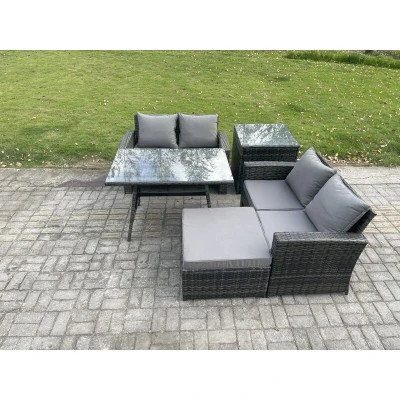 General description This 5-seater deluxe rattan sofa set is a stylish addition to your patio or garden. Made of high-quality PE rattan and durable galvanized steel construction, it offers sturdiness and longevity, making it suitable for outdoor use all year round. Technical specifications Set includes: 1 x Side coffee table (65L x 65W x 66H cm), 1 x Big footstool (65L x 65W x 34H cm), 2 x 2-seater sofas (124L x 70W x 74H cm each), 1 x Dining table (110L x 70W x 70H cm) Color: Dark grey mixed rattan with dark grey fabric Seat cushion thickness: 8 cm Glass tabletop: 5 mm thickness clear tempered glass with suckers to prevent sliding Installation Items come flat-packed and require self-assembly. Please ensure to check the product carefully upon delivery for any obvious damage. Usage This furniture set is low maintenance, featuring removable cushion covers for easy cleaning. It is recommended to keep the cushions indoors or use a rain cover when not in use. For long-term storage, cover