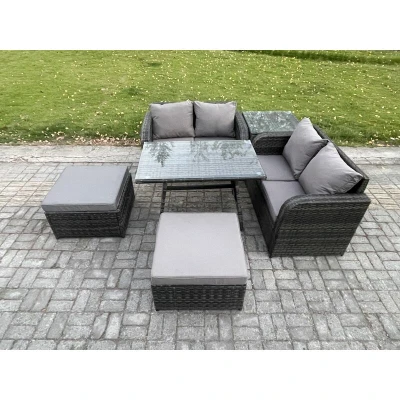 General description This outdoor garden furniture sofa set comfortably accommodates 6 people, featuring a tempered glass dining table ideal for holding food, drinks, and more. It is a perfect addition to your patio, garden, backyard, pool, and other indoor and outdoor spaces. Technical specifications Set Dimensions: 2 x Big Footstools: 65 L x 65 W x 34 H cm 1 x Side Table: 65 W x 65 L x 66 H cm 2 x Love Sofas: 124 W x 67 D x 79 H cm 1 x Rectangular Dining Table: 110 L x 70 W x 70 H cm Material: Dark grey mixed rattan with dark grey fabric Seat Cushion Thickness: 8 cm Glass Thickness: 5 mm tempered glass Installation Items come flat packed and are easy to assemble. Usage Keep the cushions indoors or use a rain cover when not in use. Use a rain cover to protect the furniture if not used for an extended period. Other information Sturdy galvanized steel tube metal frames with powder coating to prevent rust. Flat PE rattan is completely handmade. Removable cushion covers for easy