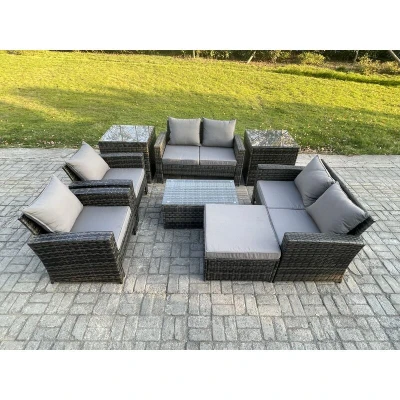 Garden Furniture Sets 8 Pieces Outdoor Rattan Manual Wicker Patio Sofa Chair Set with Coffee Table 2 Side Tables Big Footstool Dark Grey