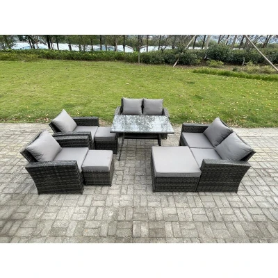Garden Furniture Sets 8 Pieces Wicker Rattan Manual Patio Sofa Conversation Set with 3 Footstools Dark Grey Mixed Fimous