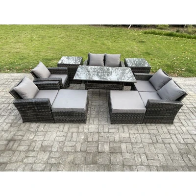 Garden Furniture Sets 9 Pieces Rattan Handmade Wicker Patio Sofa Set with 2 Big Footstool Side Tables Dark Grey Mixed Fimous