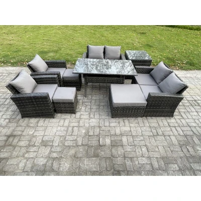 >>This outdoor garden furniture sofa set has plenty of space for 9 people to sit, with tempered glass dining table to hold food, drinks and more, a perfect addition to your patio, garden, backyard, pool and other indoor and outdoor spaces. >>Set Dimensions: • 1 x Side coffee table size:65L x 65W x 66H cm • 1 x Big footstool: 65L x 65W x 34H CM • 2 x Small Fully assembled footstool size: 40L x 40W x 37H CM • 2 x Arm chairs size: 72L x 70W x 74H CM • 2 x 2 Seater sofas size: 124L x 70W x 74H CM • 1 x Rectangular Dining Table :140L x 80W x 69H cm >> Dark grey mixed rattan with dark grey fabric .Color may vary due to light or monitor .we are unable to return the item due to this problem .Please consult us before purchase if you have requirements on color saturation >> Items Comes flat pack ,self assembled is necessary .Sturdy Galvanized Steel Tube Metal Frames With Powder Coating To Prevent The Rust,Ergonomic High Back And Declining Design For More Comfort >> Low Maintenance ,Removable
