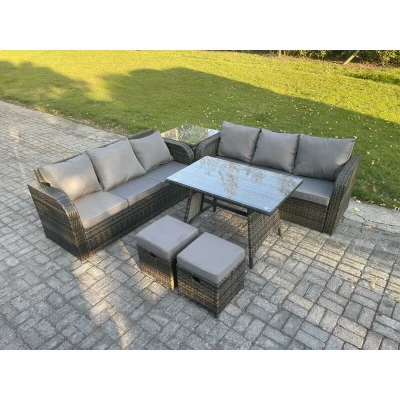 Garden Furniture Sofa Set Rectangular Dining Table 2 Small Footstool Side Indoor Outdoor 8 Seater Rattan Dark Grey Mixed Fimous