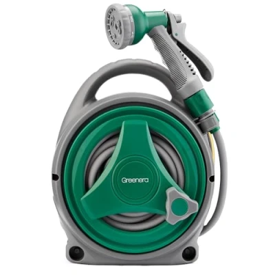 𝟴 𝗜𝗡 𝟭 𝗛𝗢𝗦𝗘 𝗥𝗘𝗘𝗟 - Complete with a 14m hose and an adjustable nozzle gun,the nozzle gun allows you to adjust the water flow.The water hose comes with 8 different spraying modes, including mist, shower, cone, flat, full, center, and jet.Press loose to stop water, safe and energy-saving ,to meet various watering needs. 𝗟𝗜𝗚𝗛𝗧 & 𝗣𝗢𝗥𝗧𝗔𝗕𝗟𝗘 - Portable Hose reel is 26cm long, 16cm wide, 30cm high and has a total weight of 1.8KG,and is designed with a carry handle,makes it easy for you to move it all around the garden,you can also attach it to the fence and wall, bringing an efficient and convenient experience to your garden. 𝟮 𝗦𝗜𝗭𝗘 𝗙𝗔𝗨𝗖𝗘𝗧 𝗖𝗢𝗡𝗡𝗘𝗖𝗧𝗢𝗥𝗦 - The compact garden hose spray gun comes with a 1/2” and 3/4” quick hose pipe connector.Just take off the first section, then the water hose with reel can fit perfectly your faucet. 𝗜𝗗𝗘𝗟 𝗙𝗢𝗥 𝗠𝗨𝗟𝗧𝗜𝗣𝗘 𝗨𝗦𝗘𝗦 - The versatile 14m hose reel suited for all watering purposes in the home such as garden,is an ideal choice for small, medium and large gardens.Also suit for watering ,car wash,pet shower,ground cleading,etc. 𝗦𝗜𝗠𝗣𝗟𝗬 𝗥𝗘𝗪𝗜𝗡𝗗 - The small garden hose reel is manual retract,When you finish watering,you could install the button and turn the shell slightly to pull the hose back for storage (empty the water in the pipe first).Please keep the hose straight and rewind slowly to avoid the hose jammed inside., Weight: 4.188782978 pounds, Manufacturer: Greenera