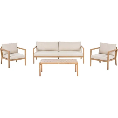 Stylish Outdoor Sofa Set with Coffee Table. Give your outdoor space a stylish update with this furniture set, featuring a spacious 3-seater sofa, two armchairs, and a practical coffee table. Durable aluminium frame is designed to imitate the warmth of wood, offering both comfort and a modern look. Perfect for relaxing in your garden or on the patio, the set includes comfy cushions for a cosy, inviting vibe. Details: Product Type: Sofa Set General Color: Brown, Beige Shade: Light Brown Material Type: Metal Main Material: Aluminium Additional Material: Fabric Material Composition: 100% Polyester Finish: Heat Transfer Seat Foam Density: 25 kg/m3 Seats Up To: 5 People Dimensions: 3 Seater Sofa Dimensions: 206x76x82 Armchair Dimensions: 73x76x82 Coffee Table Dimensions: 118x60x42 Seat Thickness: 10 cm Seat Height: 41 cm Overall Dimensions: 206x60x82 Weight: 48 kg Table Weight Capacity: 50 kg Weight Capacity per Person: 120 kg Offer Includes: 1 x 3 Seater Sofa, 2 x Armchair, 1 x Coffee