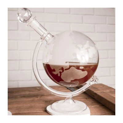 General description Drink the world dry using this classic glass globe decanter. The hand-blown borosilicate globe holds a full bottle of your favorite beverage, ready to serve in style. When not in use, the globe can be gently turned on its axis while it balances in the glass cradle. Technical specifications Height: 18 cm Width: 14 cm Capacity: 700 ml Other information The glass ball stopper provides an airtight seal to keep your alcohol fresh.