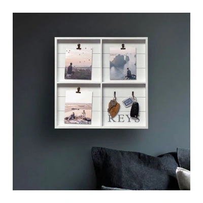 General description This charming rustic key holder doubles as an organizer and photo frame, featuring 2 sturdy hooks for keys and 3 clips for displaying photographs, drawings, postcards, or art. It serves as a memo pad for notes and reminders, helping you keep track of appointments and events right where you pick up your keys every day. Made from quality, hard-wearing wood and painted in white, it adds a delightful shabby chic feel to any space. The simple yet effective design allows it to blend seamlessly with various household decors, making it suitable for hallways, kitchens, or home offices. Technical specifications Dimensions: 39cm x 39cm x 3cm Dimensions (Individual Boxes): 18cm x 18cm Includes: 3 Clips & 2 Hanging Hooks Installation Can be hung on the wall using an attachment at the top rear Also looks effective when used freestanding Usage Store and display favorite photographs and art Leave notes and reminders for family members Organize and track upcoming appointments and