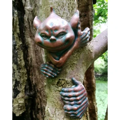 General description This unique and eye-catching goblin sculpture will be right at home mounted on your favorite tree, bringing color, character, and fun to tired garden décor. Sure to catch the eye of guests and neighbors alike, this goblin tree hugger is full of mischief and will make a welcome addition to any outdoor space! Technical specifications Material: Resin Weatherproof and waterproof Face dimensions: W 12.5 x H 10 cm One hand dimensions: 6 x 3.5 cm Two hands dimensions: 3 x 6 cm Comes in 3 parts with 3 screws for mounting Installation Screws included for easy mounting Can be mounted on trees, branches, fences, or walls Features a mounting hole at the rear Usage Perfect for outdoor decoration all year round Remains vibrant under sun, snow, and rain Durable and resistant to shrinking Other information Hand finished in bronze effect with a distressed green finish Highly detailed design