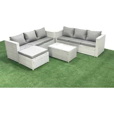 Garden Outdoor pe Rattan Furniture Set 7 Seater Sofa with Big Footstool Light Grey Mixed Fimous