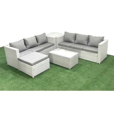 Garden Outdoor pe Rattan Furniture Set 7 Seater Sofa with Big Footstool Side Table Light Grey Mixed Fimous