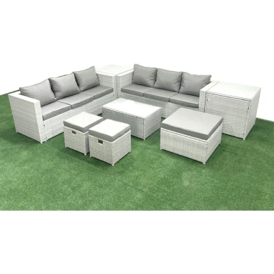 Garden Outdoor pe Rattan Furniture Set 9 Seater Sofa with 3 Footstools 2 Side Tables Light Grey Mixed Fimous