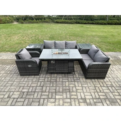 Garden Patio Furniture Wicker Rattan Gas Fire Pit Table and Sofa Chair set with 2 Side Tables Fimous