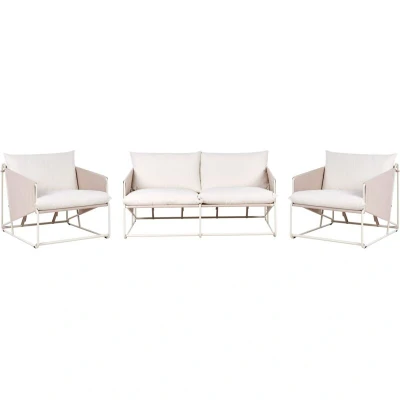 General description This oversized lounge set features a 2-seater sofa and two matching armchairs, combining contemporary design with superior comfort. Crafted with sleek metal frames and generously cushioned seating, this set creates a modern yet inviting atmosphere suitable for both indoor and outdoor use. Upholstered in waterproof fabric, the sofa and chairs are durable, easy to maintain, and resistant to changing weather conditions, making them ideal for terraces, gardens, or living rooms. Technical specifications Product Type: Lounge Set Style: Industrial General Color: Beige, Grey Frame Colour: Light Beige Material Type: Metal Main Material: Steel Additional Material: Fabric Material Composition: 100% Polyester Finish: Galvanized Seats Up To: 4 People 2 Seater Sofa Dimensions: 160x94x88 cm Armchair Dimensions: 80x94x88 cm Seat Height: 37 cm Overall Dimensions: 160x94x88 cm Weight: 62 kg Weight Capacity per Person: 110 kg Installation Full Assembly Required Usage Recommended to