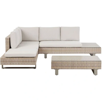 General description The Garden Corner Sofa with Table 5 Seater LANCIANO Right Hand PE Rattan Off-White is a stylish and comfortable modular garden sofa set designed for outdoor relaxation. It features a generous seating area made from light-colored polyrattan, complemented by softly padded cushions in an off-white shade. The chaise part of the sofa is fully adjustable, allowing you to convert it into a comfortable lounger. The set includes a rectangular coffee table and an additional table top on the sofa end, providing ample space for drinks and snacks. Technical specifications Product Type: Lounge Set Style: Modern General Color: White, Beige Shade: Off-White Main Material: PE Rattan Additional Material: Tempered Glass Material Composition: 100% Synthetic Material Shape: L-Shaped Orientation: Right Hand Seat Foam Density: 22 kg/m3 Seats Up To: 5 People Coffee Table Dimensions: 109x54x31 cm Seat Thickness: 8 cm Seat Height: 42 cm Sofa Dimensions: 261x210x69 cm Overall Dimensions: