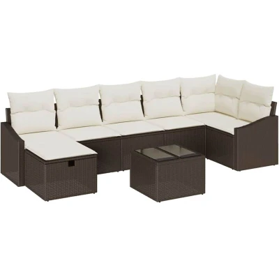 ManoManoGeneral description This Garden Sofa Set is designed for those who enjoy relaxing outdoors in style. It features a modular outdoor sectional sofa that combines flexibility with comfort, showcasing a sleek poly rattan weave that complements any garden, patio, or veranda. The modern design enhances your outdoor ambiance while providing a cozy space for you and your friends. Technical specifications Colour: Brown Material: Poly rattan Overall dimensions: 55 x 62 x 69 cm (L x W x H) Number of items: 8 Assembly required: Yes EAN: 8721288407580 SKU: 3360639 Compatibility and accessories 3 x Centre seat including storage function with a water-resistant bag 1 x Corner seat including storage function with a water-resistant bag 2 x Arm sofa including storage function with a water-resistant bag 1 x Footstool with storage function 1 x Garden table Installation Assembly is straightforward with clear step-by-step instructions. Each component is designed for easy connection, allowing two people to