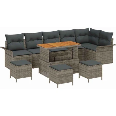 ManoManoGeneral description This Outdoor Furniture Set is a fantastic addition to any garden or terrace, offering a smart and practical style perfect for outdoor entertaining. With sleek lines and a fuss-free design, it’s ideal for summer gatherings and relaxation. Its eye-catching simplicity complements various outdoor styles, making it a great spot for meals or casual chats. The sturdy materials invite friends to kick back and enjoy. Technical specifications Materials: Solid Acacia wood and Poly Rattan Colour: Grey Max weight capacity: 1065 kg Assembly required: Yes Included components: 1 adjustable table, 2 corner sofas, 2 stools, and 7 cushions EAN: 8721288422828 SKU: 3362163 Brand: vidaXL Usage Recommended for patios, gardens, or terraces Perfect for quiet morning coffee or lively evenings chatting under the stars Care & Maintenance Use a cover when not in use Wipe down with a damp cloth to keep it looking fresh Regularly check the adjustable components to maintain its versatile design