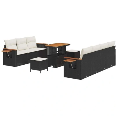 ManoManoGeneral description The Garden Sofa Set with Cushions in Poly Rattan is an excellent choice for outdoor seating, combining style and practicality. With its lovely woven finish, this set enhances any garden or terrace, making it perfect for soaking up the sun or hosting casual gatherings. Its flexible design allows for various arrangements, providing a welcoming atmosphere for relaxation and entertainment. Technical specifications Colour: Black and cream Material: Poly rattan and powder-coated steel Overall dimensions: 90 x 55 x 71 cm (L x W x H) Weight: 42.4 kg Seating area: 55 x 55 cm (W x D) Frame material: Powder-coated steel Indoor / outdoor: Outdoor only Number of items: 10 Assembly required: Yes EAN: 8721288432599 SKU: 3363140 Compatibility and accessories Includes: 4 x Arm sofas with storage function 3 x Centre seats with storage function 2 x Square stools 1 x Table Usage Ideal for outdoor fun, brightening up any terrace or garden. Perfect for spontaneous meet-ups or lazy