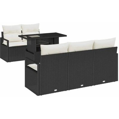 ManoManoGeneral description This Modern Garden Sofa Set offers a versatile design that meets both style and function. The sleek, minimalist aesthetic seamlessly harmonizes with outdoor environments, transforming your garden or terrace into a refined space for relaxation or social gatherings. Crafted for those who value simplicity and practicality, it invites everyone to enjoy outdoor living, from intimate family moments to festive garden gatherings. Technical specifications Colour: Black and cream Material: Poly rattan, powder-coated steel, and glass Overall dimensions: 100 x 55 x 73 cm (L x W x H) Weight: 34.2 kg Seating area: 55 x 55 cm (W x D) Frame material: Powder-coated steel Indoor / outdoor: Outdoor only Number of items: 6 Assembly required: Yes EAN: 8721158988478 SKU: 3348733 Compatibility and accessories Removable/Replaceable Cushions Installation Assembly required: Yes Usage Ideal for garden and terrace settings, suitable for both dining and lounging moments. Adaptable