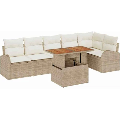 ManoManoGeneral description This Garden Dining Set with cushions is a classy mix of simplicity and practicality, making it a great pick for any outdoor space. Perfect for spring and summer days in the garden or on the terrace, this set invites you to picture cozy get-togethers under the sun, where style meets usefulness in a woven design that fits right in everywhere. Technical specifications Colour: Beige and cream Material: Poly rattan, powder-coated steel, and solid acacia wood Overall dimensions: 100 x 55 x 73 cm (L x W x H) Weight: 57.7 kg Seating area: 55 x 55 cm (W x D) Indoor / outdoor: Outdoor only Assembly required: Yes EAN: 8721158997098 SKU: 3349595 Compatibility and accessories Delivery contains: 2 x Arm sofa with storage function 1 x Corner seat with storage function 3 x Centre seat with storage function 1 x Garden table Installation This set requires two people and a screwdriver for assembly. Usage This set is great for gardens or terraces, perfect for socializing or having